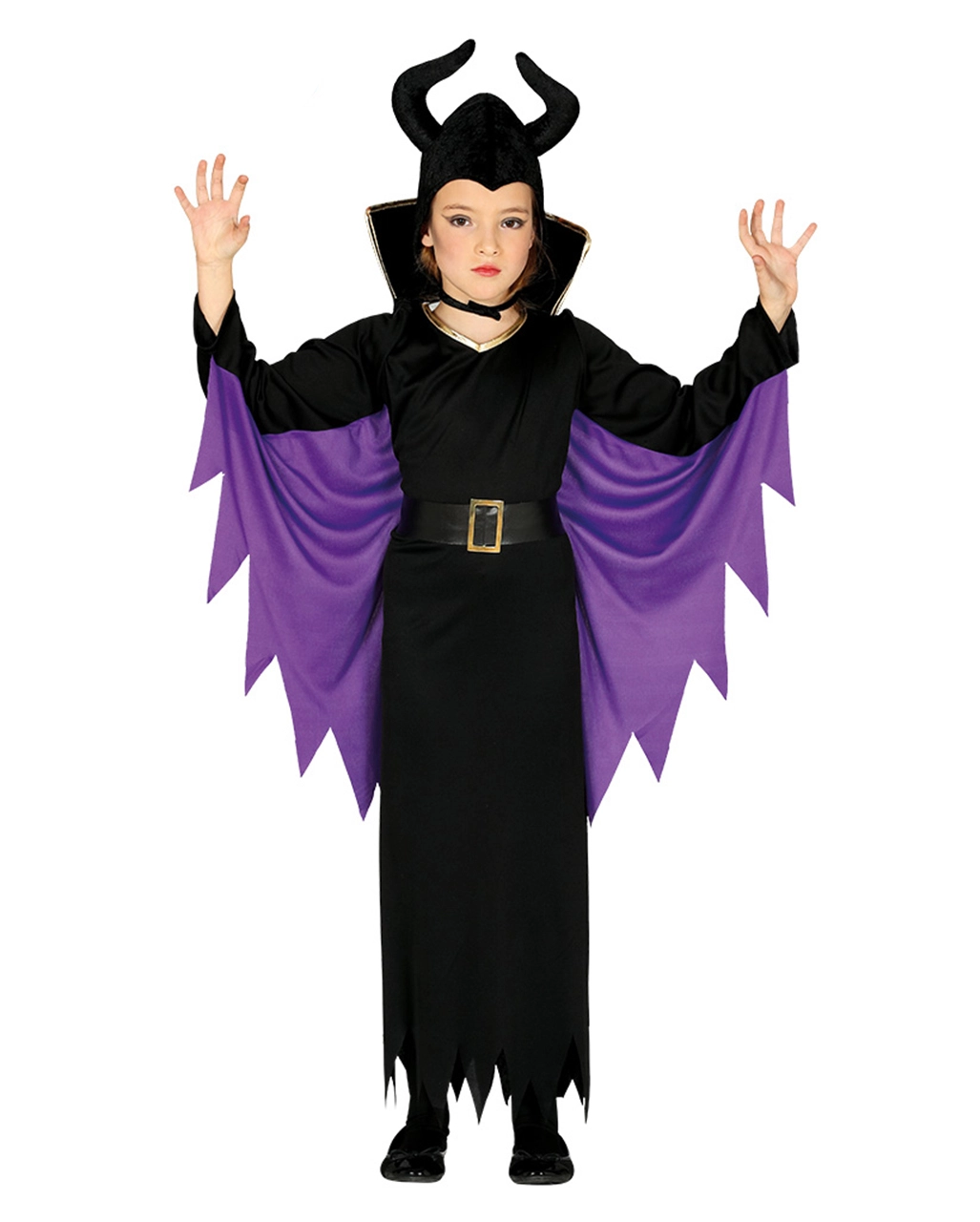 Die Böse Märchenfee Verkleidung für Kinder besteht aus einem Kostümkleid und einer gehörnten Mütze. Ein lila Zacken- “Umhang” sowie ein schwarzes Kostümkleid mit Kragen machen das Böse Märchenfee Kinderkostüm zum echten Blickfang. Die Halloween Verkleidung für Mädchen ist in Größe M, L und XL zu haben. Entdecke auch unser Malefizia Kostüm für Erwachsene.