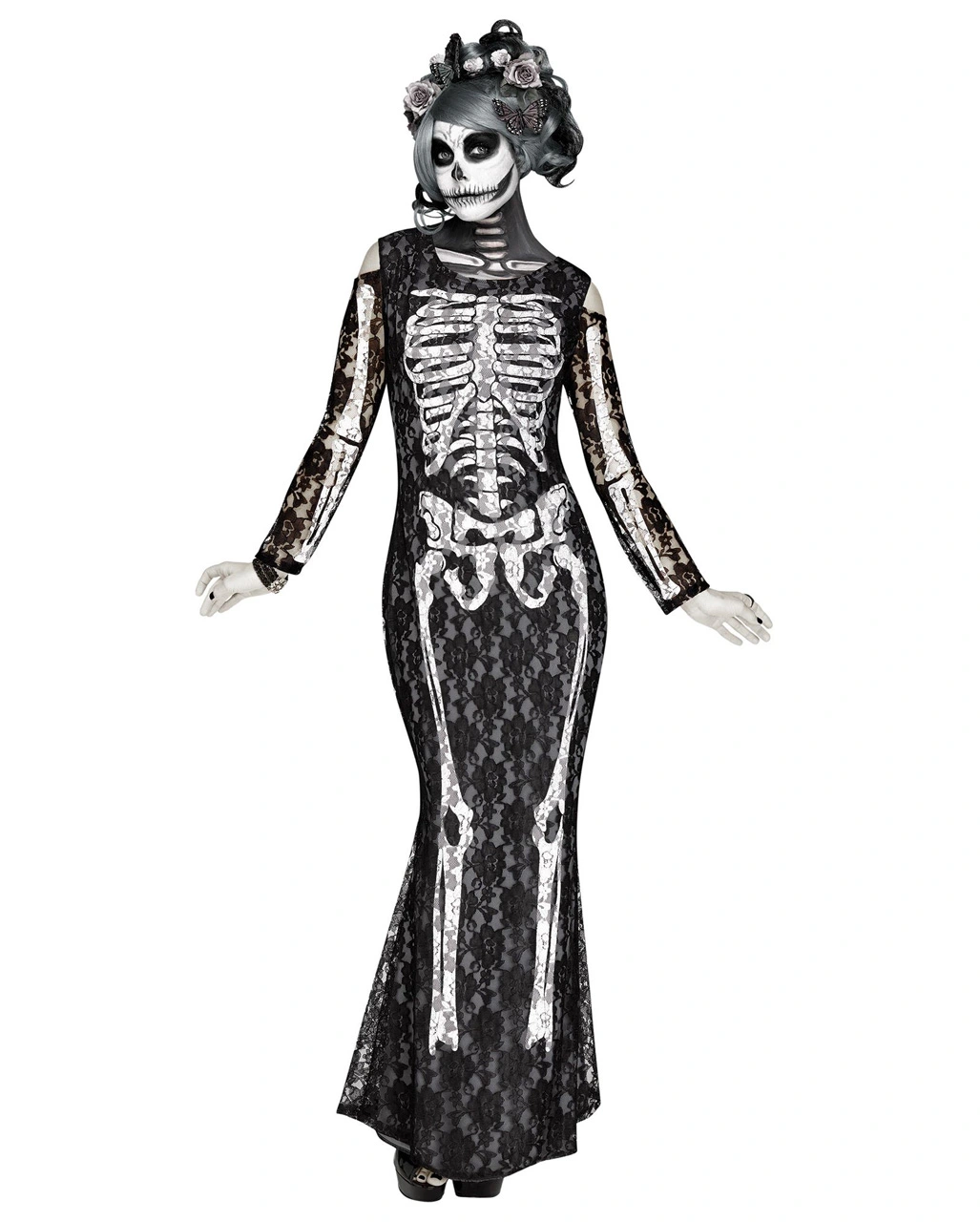 Beim Tanz der Toten wirst du das schönste aller Skelette sein. Mit deinem düsteren Skelett Kleid mit Spitze verleihst du dem Tod eine schaurig-schöne Note. Das Halloween Damenkostüm ist ein langes, figurbetontes Spitzenkleid mit Skelett-Print und passt perfekt zu gruseligen Mottofeten oder Tag der Toten Partys. Unser elegantes Spitzen Skelett Kostüm verwandelt dich eine untote Diva und verdreht allen Spukgestalten und Monstern den Kopf!