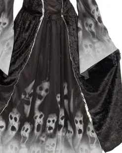 Das (alp-)traumhaft schöne Forsaken Souls Mädchenkostüm verwandelt dich in ein gruseliges Wesen, deren dunkler Aura man sich nicht entziehen kann. Das elegante Kleid mit seinem schwarzen Rock, dem Oberteil in Korsagenoptik und den weiten Trompetenärmeln versprüht den gefährlichen Charme einer zauberhaften kleinen Seelenfängerin. Die vielen geisterhaften Fratzen, die auf dem Kleid abgebildet sind, zeugen von deinem Erfolg an Halloween. Passend zu dieser besonderen Halloween Kinder Verkleidung schminkst du dich mit dem Lippenstift Schwarz.