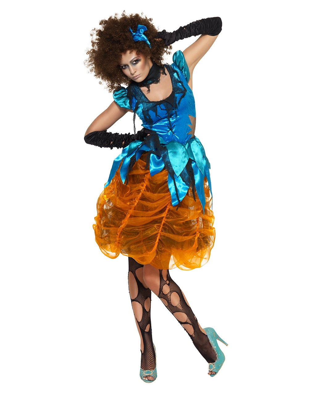 Das Killerella Kostüm besteht aus einem Kleid und einem Halsband. Das ärmellose Kleid im viktorianischen Stil besteht aus vielen verschiedenen Stoffsorten, die alle zerrissen und kaputt sind. Das Top ist aus blau und türkis glänzendem Stoff. Schwarze Stoffstreifen umrahmen den Ausschnitt. Dreieckige blau-türkise Stoffstücke hängen auch von der Hüfte ab über den Rock, aber auch der schwarze Stoff hängt in Fetzen herum. An einer Seite hat das Top ein Loch, das mit schwarzem Gaze hinterlegt ist. Der orangene Tüll-Stoff des Rocks ist auf typisch viktorianische Art gerafft. Der Rock geht ganz un-viktorianisch nur bis zum Knie. Das Halsband besteht aus unregelmäßig geschnittenem schwarzen Stoff. Eine Grobnetz Strumpfhose schwarz, ein Paar türkise Riemchen Peeptoes Schleife und die Party Perücke gelockt Schwarz machen Killerella fit für den Prinzenball.