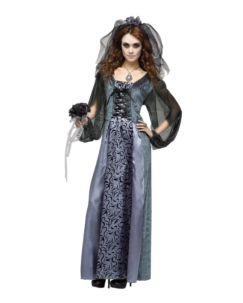 Das bodenlange Mystery Monster Brautkostüm ist zweiteilig und besteht aus einem Tüllschleier in schwarz-grau und mit Rosen an der Haarklammer sowie dem traumhaften Kleid. Das petrolfarbene Samtkleid hat vorne einen blau-grauen Satineinsatz, der teilweise mit schwarzen Ornamenten bedruckt ist. Am Ausschnitt ist der Einsatz gerafft und im Brustbereich ist eine schwarze Schnürung angebracht. Die Ärmel bestehen aus schwarzem Netz und sind seitlich nicht zusammengenäht. Nur am Handgelenk sind sie befestigt. Verschlossen wird das traumhafte Kleid mit einem Band im Nacken. Abrunden kannst du das Kostüm mit der Kamee Halskette Engelsflügel und den Viktorianische Stiefel mit Schnallen.