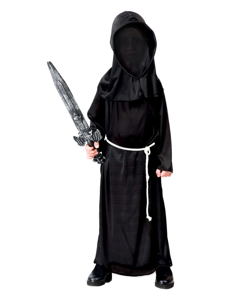 Das Phantom der Dunkelheit Kinderkostüm besteht aus einer langen schwarzen Kutte, die mit der schwarzer Haube mit durchsehbaren Frontbereich und der silbernen Kordel kombiniert wird. Um den gruseligen Anblick noch zu verstärken empfehlen wir ein Antikes Totenkopfschwert und das Kinder Make Up Set.