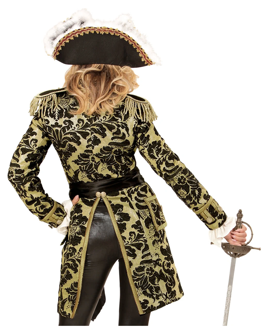 Der golden-schwarze venezianische Damenfrack ist aus schwerem Stoff gearbeitet und besitzt ein wunderschönes florales Muster aus goldener Stickerei auf schwarzem Stoff. Die Verzierung aus Goldborte sowie die Metallknöpfe ergeben zusammen mit den Schulterklappen und deren Fransen einen eleganten Look. Optisch erinnert der Parade-Tailcoat sofort an schwere Brokatmäntel und eignet sich daher perfekt für Figuren aus der Zeit des Barock und Rokoko. Mittels eines geschickt versteckten Reißverschlusses kannst du deinen Brokat Frack schließen. Dank eines taillierten Schnittes wirkt der Piraten Frack keinesfalls sackig. Dazu passen ein Edler Musketierhut und Piraten Damen Stiefel.