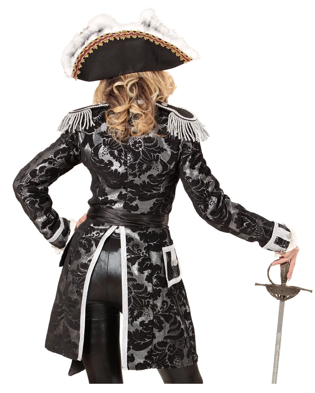 Der silbern-schwarze venezianische Damenfrack ist aus schwerem Stoff gearbeitet und besitzt ein wunderschönes florales Muster aus silberner Stickerei auf schwarzem Stoff. Die Verzierung aus Silberborte sowie die Metallknöpfe ergeben zusammen mit den Schulterklappen und deren Fransen einen eleganten Look. Optisch erinnert der Parade-Tailcoat sofort an schwere Brokatmäntel und eignet sich daher perfekt für Figuren aus der Zeit des Barock und Rokoko. Mittels eines geschickt versteckten Reißverschlusses kannst du deinen Brokat Frack schließen. Dank eines taillierten Schnittes wirkt der Piraten Frack keinesfalls sackig. Dazu passen ein Edler Musketierhut und Piraten Damen Stiefel.