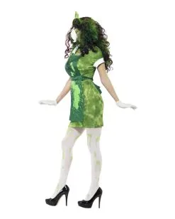 Das giftig grüne Zombie Laborschwester Kostüm besitzt mit seinem Paar Gummihandschuhe und dem Mundschutz nicht nur die Accessoires einer Labormitarbeiterin, dank dem Kleid und einem schmucken Haarreif sieht es sogar nach einer sexy Krankenschwester aus. Das Kleid wird einfach über den Kopf gezogen. An den Ärmeln sowie am Kragen sind weiße Stoffränder angenäht. Auf dem Haarreif und der mit hellgrünen Flecken gesprengelten Schürze ist das Siegel für Biogefährdung abgebildet. Um deiner Verkleidung als Zombie Laborschwester ein originelles Aussehen zu verpassen, kannst du einfach das Zombie Schmink Set verwenden. Die Hostel Folterspritze ist dann das passende Schmuckwerk für die Verkleidung.